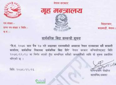 धरान: रामनवमीको अवसरमा सरकारले भोली आइतबार सार्वजनिक विदा दिएको छ । गृह मन्त्रालयका प्रवक्ता फडिन्द्रमणि पोखरेलले एक सुचना जारी गर्दै आइतबार रामनवमीको अवसरमा देशभरका सबै सरकारी कार्यालय, सार्वजनिक निकायमा सार्वजनिक विदा दिने जानकारी गराएका हुन् । प्रवक्ता पोखरेलका अनुसार चैत २४ गते बसेको मन्त् ...