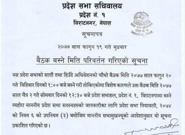 विराटनगरः भोली(बिहिबार) बस्ने तय भएको प्रदेश १ को संसद बैठक चैत २ गतेका लागि सरेको छ । गत फागुन ९ गते बसेको प्रदेश सभाको बैठकमा मुख्यमन्त्री शेरधन राई विरुद्ध अविश्वासको प्रस्ताव पेश भएको थियो । फागुन २० गते बस्ने बैठकमा उक्त प्रस्तावमाथि छलफल हुने अपेक्षा गरिएको थियो । तर, सबै दलको सहमती भएको भन्द ...