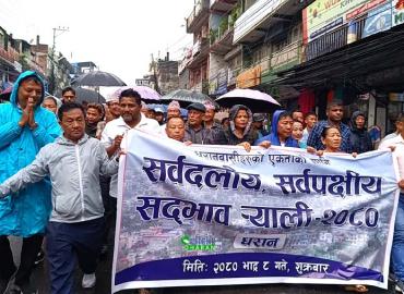 धरान: धरानको धार्मिक एवं सामाजिक सद्भाव कायम राख्न शुक्रबार सर्वदलीय एवं सर्वपक्षीय सद्भाव र्याली निकालिएको छ । नागरिक अगुवा, पुर्वजनप्रतिनिधि एवं राजनीतिक दलहरुको आह्वानमा शुक्रबार दिउँसो सर्वदलीय एवं सर्वपक्षीय सद्भाव र्याली निकालिएको हो । झरीको बीचमा पनि निस्किएको र्याली भानुचोकमा पुगेर काण ...