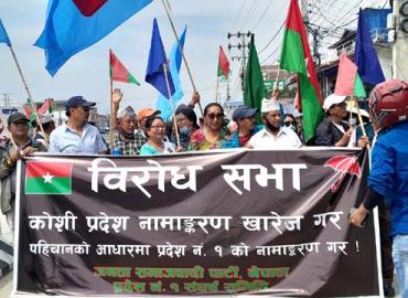 धरान: कोशी प्रदेश नामकरण खारेजीको माग गर्दै पहिचान पक्षधरहरुले आइतबार इटहरीमा विरोध प्रर्दशन गरेको छ । प्रदेश नं १ पुनः नामंकन संयुक्त संघर्ष समितिको आयोजनामा इटहरी मुख्य बजार क्षेत्रमा प्रर्दशन तथा कोणसभा भएको हो । इटहरीको चौरास्त चोकमा प्रदर्शन हुँदा दुई घण्टा बढी सडक ठप्प भएको थियो भने याताय ...