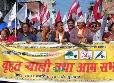 धरान: नेकपा एमाले र जनता समाजवादी पार्टीको संयुक्त चुनावी आमसभा धरानमा भइरहेको छ । भानुचोकमा आयोजित अन्तिम चुनावी सभामा हजारौंको उपस्थिति रहेको छ । सभाको प्रमुख अतिथि एवं वक्ताकोरुपमा नेता गुरु वराल आएका छन् । निर्वाचन परिचालन मुल कमिटीका संयोजक मीनकुमार सुब्बाले अध्यक्षताको आसन ग्रहण अघि मन्त ...