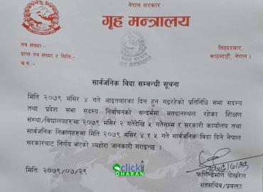 धरान: सरकारले मंसिर ४ र ५ गते सार्वजनिक विदा दिने निर्णय गरेको छ । मंसिर ४ गते हुन लागेको प्रतिनिधिसभा र प्रदेशसभा निर्वाचनको सन्र्दभमा दुई दिने विदा दिने निर्णय गरेको गृह मन्त्रालयले जानकारी दिएको छ । मन्त्रालयका सहसचिव एवं प्रवक्ता फडिन्द्रमणी पोखरेलका अनुसार सरकारी निकाय तथा सार्वजनिक कार्य ...