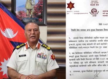 धरान: जेनजी आन्दोलनको नाम गरेर अराजकता मच्याउने समुह सक्रिय भएपछि सुरक्षाको जिम्मेवारी नेपाली सेनाले लिएको छ ।नेपाली सेनाले एक सुचना जारी गर्दै मंगलबार राती १० बजेपछि नेपाली सेना परिचालन भएको जानकारी दिएको हो । नेपाल र नेपालीको सुरक्षाको लागि स्थिति नियन्त्रण लिन भदौ २४ गते राती १० बजेबाट दृढ रहने प ...