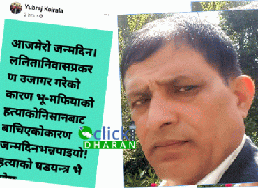 धरानः चर्चित ललिता निवास जग्गा प्रकरण उजागर गर्ने अधिवक्ता युवराज कोइरालाको आज जन्मदिन । उनले आफ्नो जन्मदिन मनाउदै गर्दा हत्याको षडयन्त्र भइरहेको खुलासा पनि गरेका छन् । सामाजिक सञ्जाल फेसबुकमा उनले ‘ललिता निवास प्रकरण उजागर गरेको कारण भुमाफियाको हत्याको निसानबाट बाँचिएको कारण जन्मदिन भन्न पाइ ...