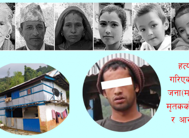 धरान: संखुवासभाको मादी नगरपालिका १ मा एकै परिवारको ६ जनाको हत्याको आरोपमा आफन्त पर्नेलाई प्रहरीले पक्राउ गरिसकेको छ । उनलाई भोली सार्वजनिक गर्ने प्रहरीको तयारी छ । पक्राउ पर्ने २६ बर्षीय लोकबहादुर कार्की हुन् । उनको घर मृतकहरुको घरदेखि करिब एक सय मिटर दुरीमा छ । उनले हत्या गरेको स्वीकार गरिसकेक ...