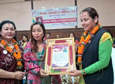 धरान: उद्यमी बनेर आत्मनिर्भर हुँदै रोजगारीसमेत सृर्जना गर्न सफल दुई जना महिला उद्यमी धरानमा सम्मानित भएका छन् । धरान १२ चतरालाइनस्थित चौबिसे सङयक ढाका उद्योग र सोरुमकी प्रोपाइटर महिला उद्यमी यमुना तुम्सा र रामधुनी नगरपालिकाकी उद्यमी सृर्जना भट्टराई सम्मानित भएकी हुन् । दुवैलाई सोमबार धरानमा नेपाल उद ...