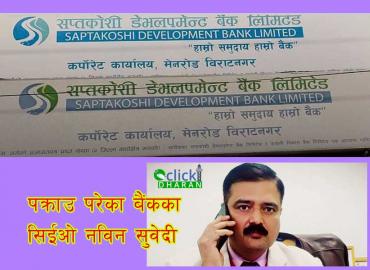 विराटनगर: विराटनगर महानगरपालिका ७ मा कर्पोरेट कार्यालय रहेको सप्तकोशी डेभलपमेन्ट बैंक लिमिटेडमा करोडौं रकम घोटाला प्रकरणमा सिईओसहित ४ जना पक्राउ परेका छन् । मोरङ प्रहरीका अनुसार बैंकका सिईओ विराटनगर ६ का ४७ बर्षीय नविन सुवेदी, लेखा वित्त प्रमुख ४८ बर्षीय देवीप्रसाद भण्डारी, अपरेशन प्रमुख ३६ बर् ...