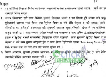 धरान: जिल्ला प्रशासन कार्यालय सुनसरीले होटल तथा रेष्टुरेष्टहरु निषेधाज्ञाको बेला बिहान ८ बजेदेखि बेलुकी ८ बजेसम्म खोल्न पाउने निर्णय सच्याउदै नयाँ नियम लागु गरेको छ ।आज बसेको डिसिसिएमसि बैठकले यसअघिको निर्णयको अपव्यख्या गरिएको भन्दै अबदेखि राजमार्ग छेउछाउमा रहेका यात्रुलाई खाना खुवाउने रेष्टुरेष्ट म ...