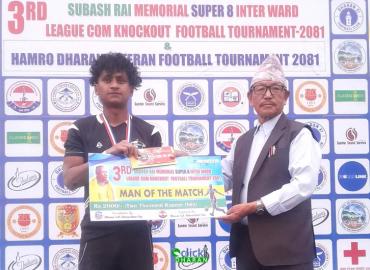 धरान: तेस्रो सुवास राई स्मृति सुपर ८ फुटबल प्रतियोगितामा आइतबार वडा १७ र वडा १४ बिचको फाइनल खेल रोचक बन्यो ।धरान १६ स्थित रंगशालामा भएको फाइनल खेलको निर्णयविहिन भएको छ । निर्धारित समयको खेल गोलरहित बराबरीमा सकिए पछि खेल टाइब्रेकरमा पुगेको थियो । टाईब्रेकरमा पनि ४-४ गोल भएपछि खेल सडन डेथमा पुग्यो । स ...