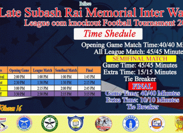 धरान: भोली बिहिबारदेखि धरानमा स्वर्गीय सुवास राई स्मृति सुपर ८ लिगकम नकआउट अन्तर वडास्तरीय फुटबल प्रतियोगिता शुरु हुदैछ । धरान १६ स्थित रंगशालामा हुने प्रतियोगिताको उद्घाटन खेल धरानको वडा नं १७ र वडा नं ११ बीच हुनेछ । प्रतियोगिताको फाइनल जेठ २७ गते हुनेछ । प्रतियोगिताको आयोजक धरान उपमहानगरपालिका हो ...