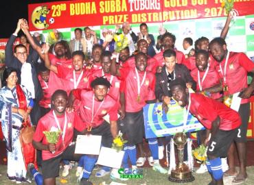धरान: २३ औं बुढासुब्बा टुबोर्ग गोल्डकप फुटबल प्रतियोगितामा क्यामरुनको एभेनियर एफसि च्याम्पियन भएको छ । धरान १६ स्थित रंगशालामा शनिबार भएको फाइनल खेलमा काकडभिट्टा फुटबल ट्रेनिङ सेन्टर (केएफटिसि), झापालाई १–० ले पराजित गर्दै क्यामरुनी क्लब च्याम्पियन भएको हो । पहिलो हाफ गोलरहित बराबरीमा टुंगिए प ...