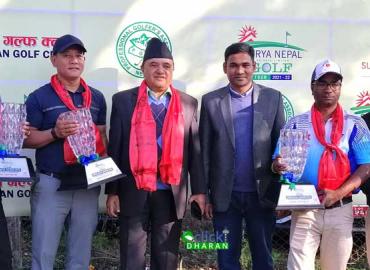 धरान: इष्टर्न ओपन गल्फ प्रतियोगितामा बिहिबार प्रो–एम स्पर्धा भएसँगै चार दिने सुर्य नेपाल गल्फ टुर धरानमा समापन भएको छ । पार ७० को धरान गल्फ कोर्षमा बिहिबार भएको प्रो–एम स्पर्धामा व्यवसायिक खेलाडी धनबहादुर थापाको टिम विजयी भएको छ । थापाको टिमले कुल १५२ स्कोर गर्दै उपाधि जितेको हो । थापाले ३७ स् ...