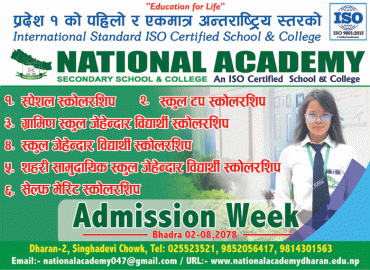 धरान: नेशनल एकेडेमी सेकेण्डरी स्कुल तथा कलेजले छात्रवृत्रि कार्यक्रमको साथ भदौ २ गतेदेखि एक साता एडमिसन विक मनाउने घोषणा गरेको छ । अन्तर्राष्ट्रिय गुणस्तर आईएसओ चिन्ह लिन सफल प्रदेश नं. १ को पहिलो र एकमात्र स्कूल तथा कलेज नेशनल एकेडेमी सेकेण्डरी स्कुल तथा कलेजले आफ्नो छात्रवृति कार्यक्रमको साथमा आगा ...