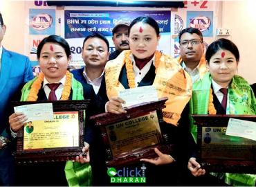 धरान: धरान १६ स्थित युएन कलेजले आफ्नो कलेजको बिएचएम फ्याकल्टीतर्फ प्रदेश १ मै प्रथम र तृतीय हुन सफल विद्यार्थीहरुलाई नगदसहित सम्मान गरेको छ । कलेजले आज एक कार्यक्रमको आयोजना गरि ३ जना विद्यार्थीहरुलाई सम्मान गरेको हो । तीनै जना छात्रा हुन् । विएचएमको पहिलो सेमेस्टरमा युएन कलेजका विद्यार्थी ऋतु राई ...