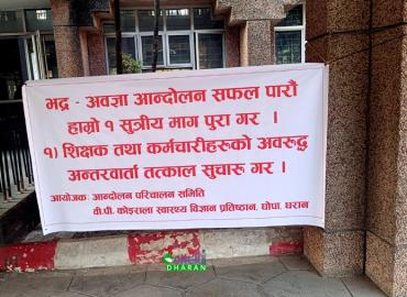 धरान: बीपी कोइराला स्वास्थ्य विज्ञान प्रतिष्ठानको कार्यकारिणी बैठक आज बिहान पनि बस्दैछ ।हिजो राती भिआईपी गेष्ट हाउसमा बसेको बैठक निष्कर्षमा पुग्न नसके पछि आज बिहान ९ बजेदेखि पुनः बैठक सुरु भएको छ । बैठक सुरु भएपछी भद्र अबज्ञा आन्दोलनमा रहेका शिक्षक कर्मचारीहरु पनि गेस्ट हाउस प्रवेश गेट बाहिर भेला भए ...