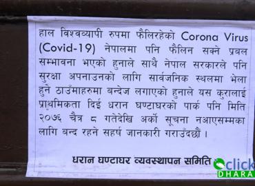 धरान: कोरोना भाइरस(कोभिड १९) को संक्रमण फैलन नदिन धरानमा पनि अत्यावश्यकबाहेक सबै बजार, होटल, मनोरञ्जन, खेलस्थलहरु बन्द भएका छन् । आज बिहानदेखि एकबाट अर्को जिल्ला चल्ने सवारीसाधनहरु पनि बन्द भएका छन् । धरानको सिनेमा घर, सुनचाँदी पसल, घण्टाघरलगायत सबै बन्द भएका छन् । इलाका प्रहरी कार्यालय धरानका डिएस ...