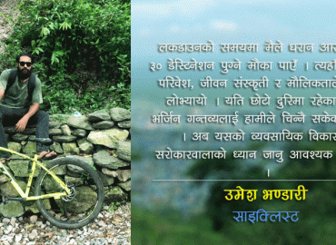धरानः लामो समय वेलायत बसेर अध्ययनपश्चात नेपाल फर्किएका उमेश भण्डारी घुुम्नमा सौखिन छन् । सन् २०१७ मा नेपाल फर्किएका उनी पहिले देश घुुम्ने योजना बनाए, अनि काम खोज्ने । धरान जानकी टोलका उनी नेपाल घुुम्ने धोको वेलायत बस्दै बनाएका थिए । प्रायः एक्लै घुुम्न रुचाउने भएपनि घुुम्ने योजना साथीहरुले थाहा पा ...