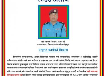 विराटनगर: जिल्ला प्रहरी कार्यालय तेह्रथुममा कार्यरत प्रहरी सहायक निरीक्षक कुमार राई असोज महिनाको सर्वोत्कृष्ट प्रहरी (वेष्ट पुलिस अफ द मन्थ) घोषित भएका छन् । अपराध अनुसन्धानको क्षेत्रमा विशेष योगदान पुर्याउनुको साथै विभिन्न जघन्य अपराधमा फरार प्रतिवादीहरुलाई पक्राउ गरि कानूनी कारवाहीको दायरामा ...