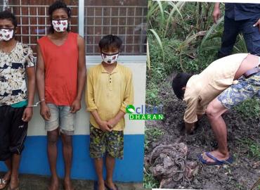झापा: झापाको अर्जुनधारा ५ स्थित बैसाबारीमा गोरु काटेर खाएको आरोपमा तीन जना पक्राउ परेका छन् । पक्राउ पर्नेमा २० बर्षीय ईमन दाहाल, २७ बर्षीय विर बहादुर दनुवार र २७ बर्षीय टिकाराम दनुवार रहेका छन् । आज बिहान ८ बजे उनीहरुले गोरु काटेर खाएको आरोप छ । उनीहरुले गोरुको टाउको र खुट्टाहरू नजिकै रहेको उखुबार ...