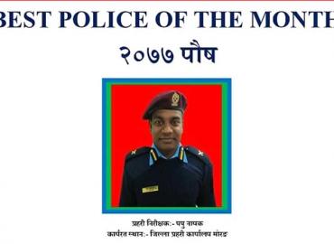 विराटनगर: जिल्ला प्रहरी कार्यालय मोरङमा कार्यरत प्रहरी निरीक्षक पपु नायक पुष महिनाको सर्वोत्कृष्ट प्रहरी (वेष्ट पुलिस अफ दि मन्थ) घोषित भएका छन् । अपराध अनुसन्धानमा विशेष योगदान पुर्याएको, साथै चोरी, अवैध लागुऔषध कारोबारी लगायत विभिन्न अपराधिक घटनाका फरार प्रतिवादी पक्राउ गरेर कानुनी दायरामा ल ...